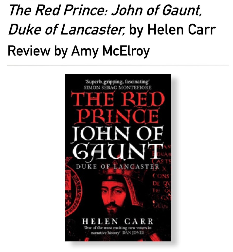 I was privileged to receive an advanced copy of The Red Prince, John of Gaunt Duke of Lancaster written by Helen Carr. My review of the book is available in Aspects of History so I won’t be posting it here but I will say it’s fabulous! The Red Prince published yesterday and I would highly recommend to all history fans to get yourself a copy.